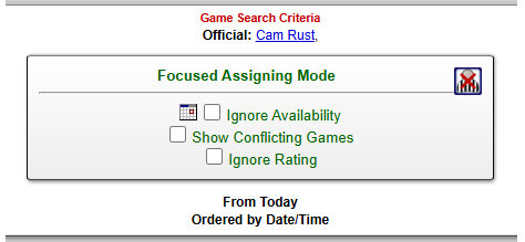 In the game search form, you will find a new option along the right side called "Focused Assign.". If you choose just one official and this option, that will put you into the Focused Assigning Mode.